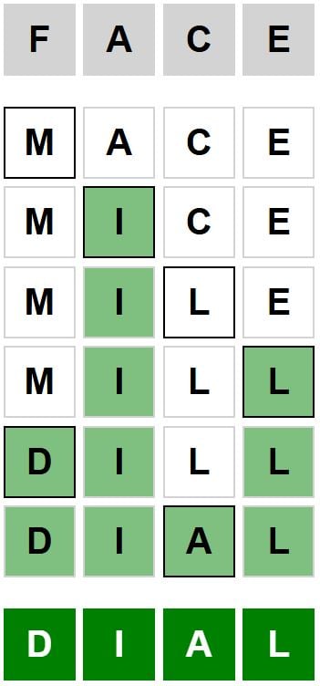 The starter word for the Weaver puzzle released today, October 9th 2025, is ‘FACE‘ and the end word is ‘DIAL‘.