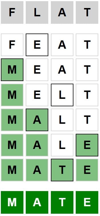 The starter word for the Weaver puzzle released today, November 6th 2025, is ‘FLAT‘ and the end word is ‘MATE‘.