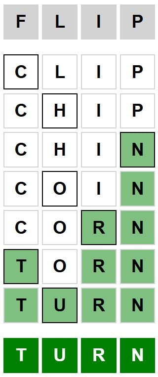 The starter word for the Weaver puzzle released today, October 4th 2025, is ‘FLIP‘ and the end word is ‘TURN‘.