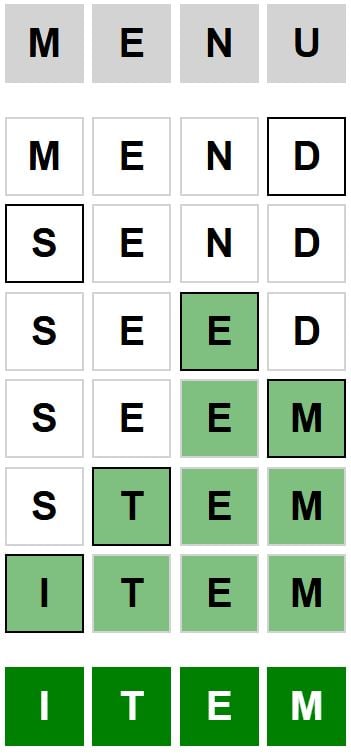 The starter word for the Weaver puzzle released today, April 9th 2026, is ‘MENU‘ and the end word is ‘ITEM‘.