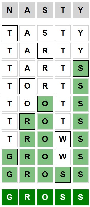 The starter word for the Weaver puzzle released today, August 24th 2025, is ‘NASTY‘ and the end word is ‘GROSS‘.