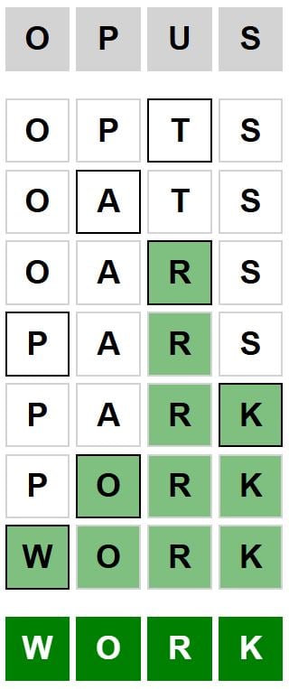 The starter word for the Weaver puzzle released today, January 10th 2026, is ‘OPUS‘ and the end word is ‘WORK‘.