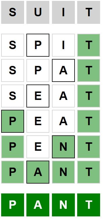 The starter word for the Weaver puzzle released today, December 12th 2025, is ‘SUIT‘ and the end word is ‘PANT‘.