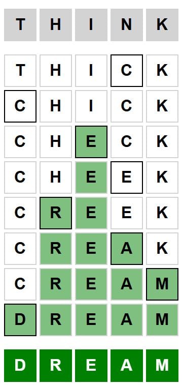 The starter word for the Weaver puzzle released today, November 16th 2025, is ‘THINK‘ and the end word is ‘DREAM‘.