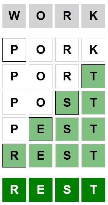 The starter word for the Weaver puzzle released today, October 8th 2025, is ‘WORK‘ and the end word is ‘REST‘.