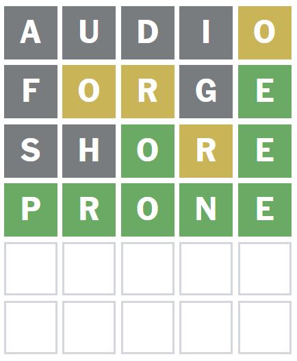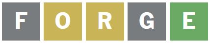 I then wanted to guess a word that puts the O in a different position and has an E in it, so I guessed the word ‘FORGE’ next.