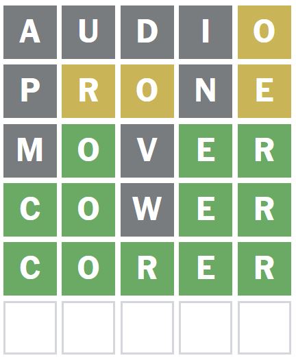 I guessed the word ‘COWER’ next, which placed the C correctly.