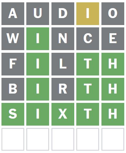 I wanted to guess a word that puts the I in a different position and has an E in it, so I guessed the word ‘WINCE’ next.