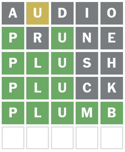 I wanted to guess a word that puts the U in a different position and has an E in it, so I guessed the word ‘PRUNE’ next.