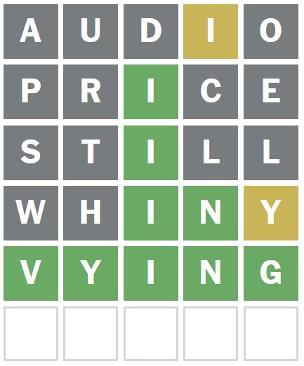 ‘WHINY’ was the next word I guessed, which placed the N correctly as the fourth letter and it showed me that there is a Y in the Wordle answer today.