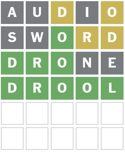‘DRONE’ was the next word I guessed, which placed the D and R correctly, leaving the last two letters to be guessed.