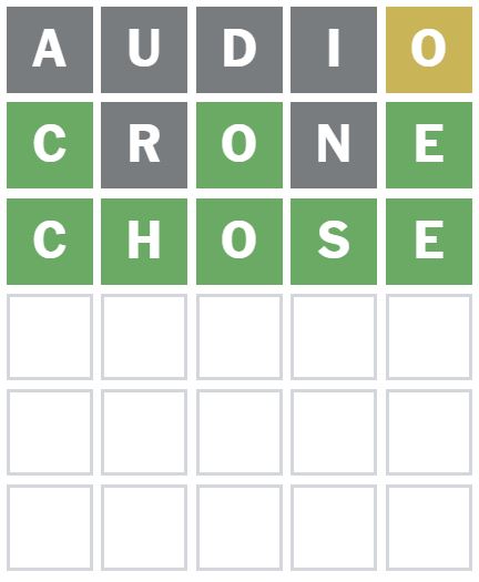 I then wanted to guess a word that puts the O in a different position and has an E in it, so I guessed the word ‘CRONE’ next.