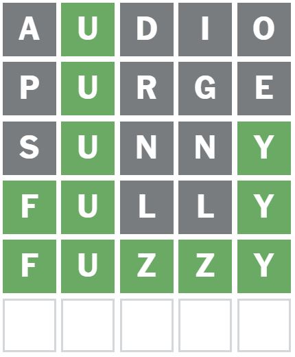 I guessed the word ‘SUNNY’ next, which placed the Y correctly as the last letter.