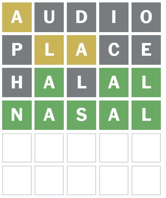 ‘HALAL’ was the next word I guessed, which placed both A’s and L correctly in the answer, leaving the first and third letters to be solved.