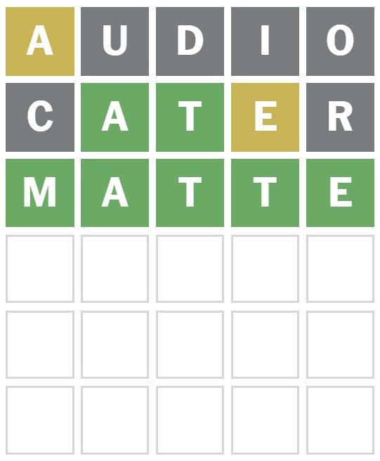 This was a great word to guess as it put the A and T in the correct positions and showed me there is an E in the Wordle answer today.
