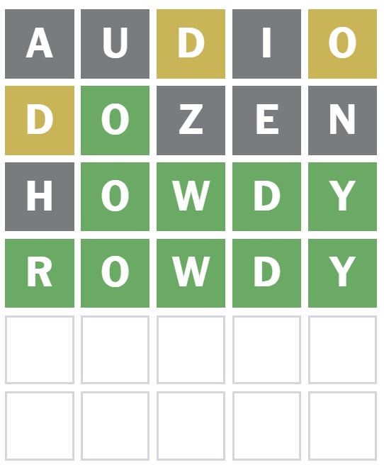 ‘HOWDY’ was the next word I guessed, which placed the W, D and Y correctly.
