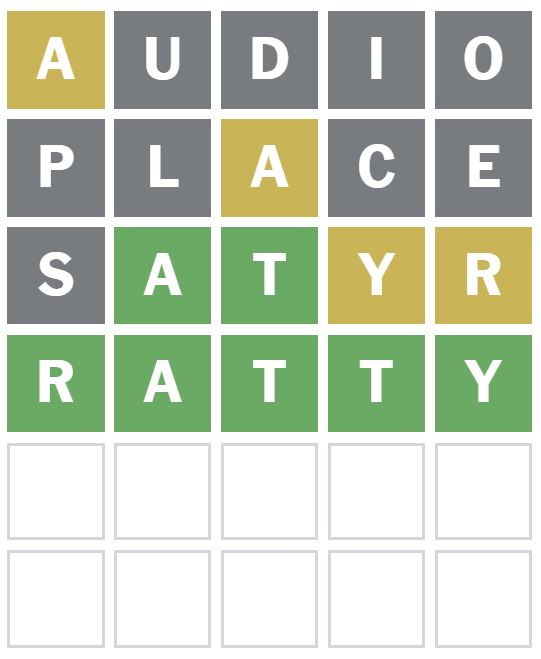 The next word I thought of was ‘SATYR’, which was a great word to guess as it placed the A and T correctly in the Wordle answer today.