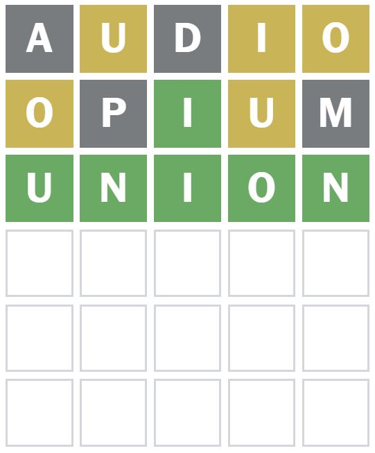 Here is how I managed to solve Wordle 1526 in three guesses today. I guessed the word ‘AUDIO’ first, which is my usual starter word.