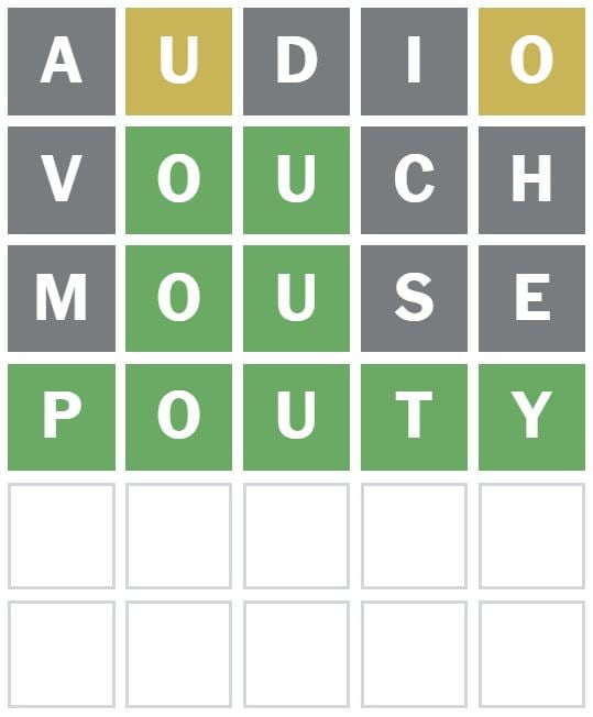‘VOUCH’ was the next word I thought of, which placed the vowels correctly in the Wordle answer today.