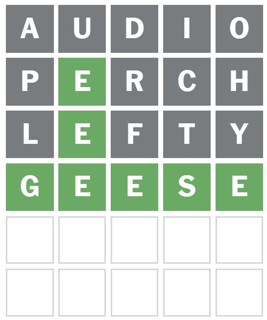 I then wanted to guess a word that has an E in it, so I guessed the word ‘PERCH’ next.