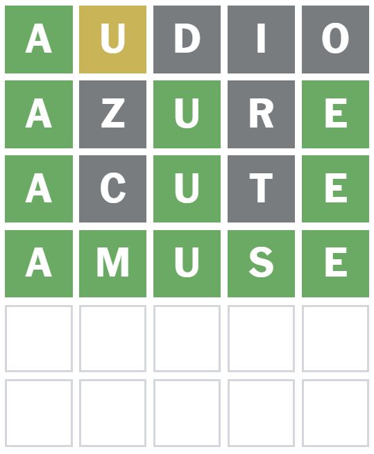 This was a great starter word for today as it placed the A correctly as the first letter and showed me there is a U in the Wordle answer today.