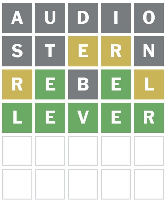 This was a great guess as it placed both E’s correctly and showed me there is an L in the Wordle answer today.