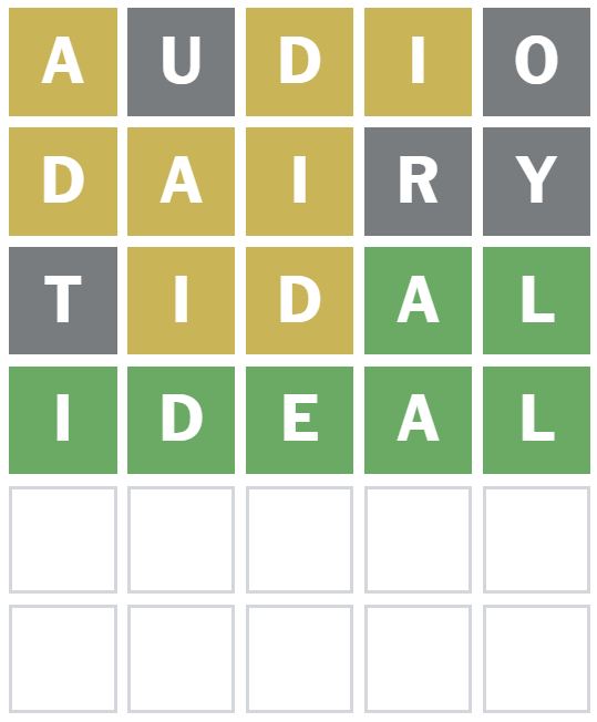 I then thought the I would be the second letter and A the fourth. ‘TIDAL’ was the next word I decided to guess.