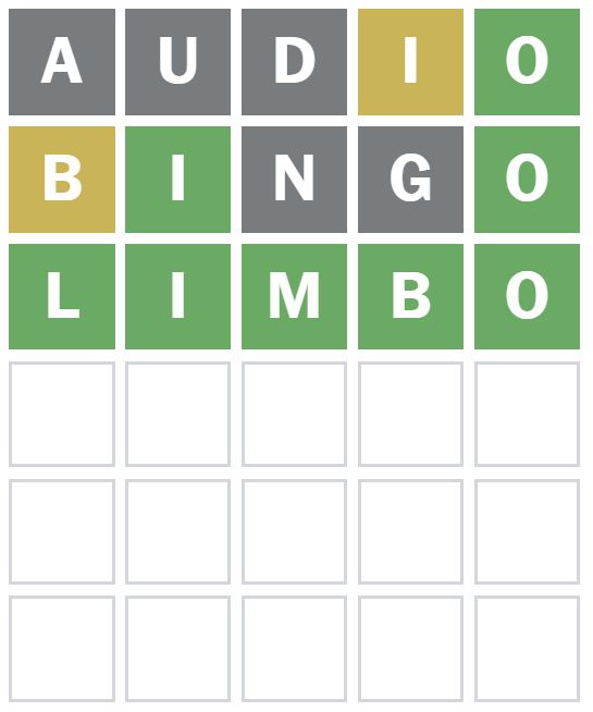 I then guessed a word that puts the I in a different position, and the first word that came to mind was ‘BINGO’.