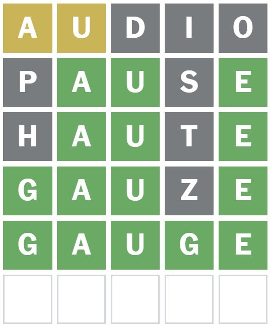 I guessed the word ‘GAUZE’ next, which placed the G correctly as the first letter, leaving the fourth letter to be guessed.