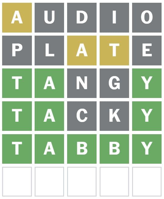 ‘TACKY’ was the next word I decided to guess, but this is not the Wordle answer today.