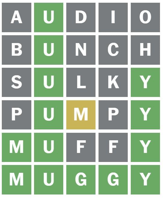 Here is how I managed to solve Wordle 1625 in six guesses today. I guessed the word ‘AUDIO’ first, which is my usual starter word.