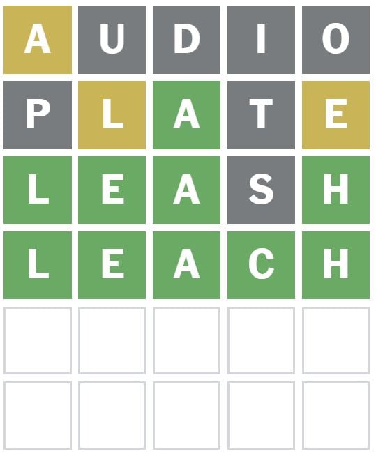 I guessed the word ‘LEASH’ next as it puts the known letters in different positions.