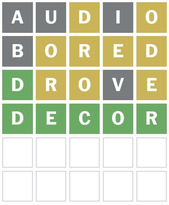 ‘DROVE’ was the next word I guessed, which placed the D correctly as the first letter.