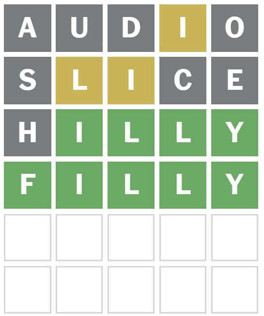 I guessed the word ‘HILLY’ next which placed the last four letters correctly.