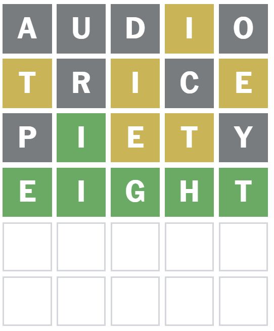 ‘PIETY’ was the next word I guessed as it puts the known letters in different positions and I thought the E might be after the I.