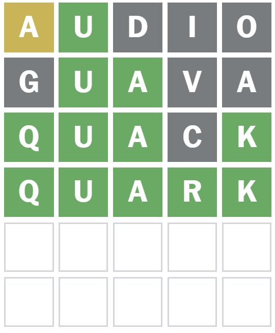 I then thought the first letter could be a Q, so I guessed the word ‘QUACK’ next.