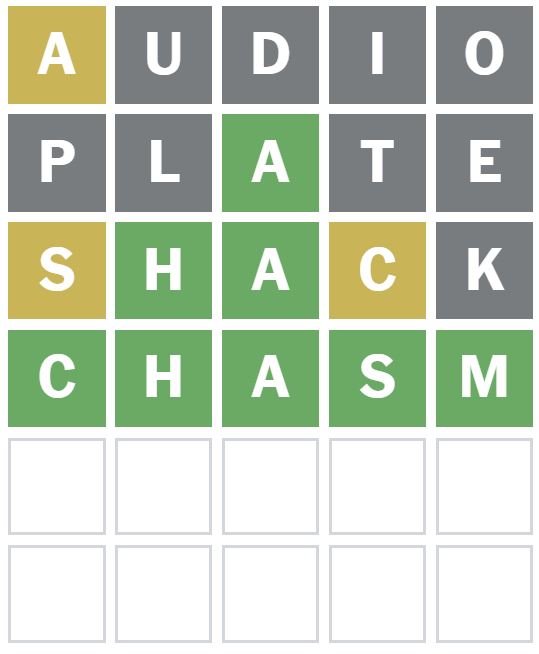 ‘SHACK’ was the next word I guessed, which correctly placed the H as the second letter and showed me there is an S and C in the Wordle answer today, although these letters have not been placed correctly.