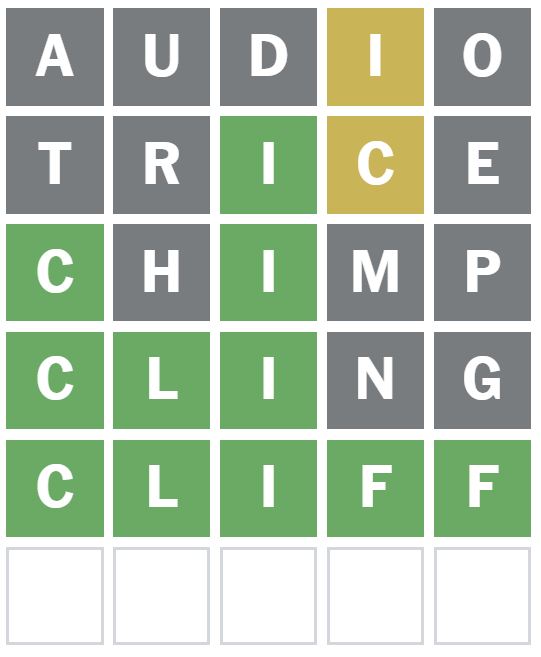 I then guessed the word ‘CLING’ next as it uses different letters than the ones already guessed.