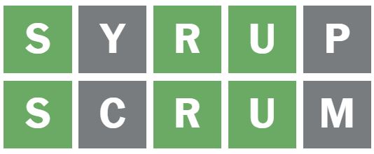 Only the second and fifth letters were left to be guessed, so I guessed the words ‘SYRUP’ and ‘SCRUM’ next.