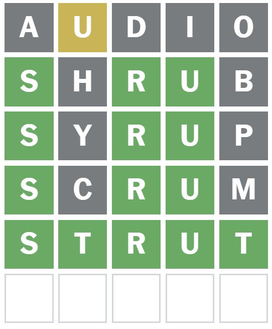 This was a great word to guess as it placed the S, R and U correctly.