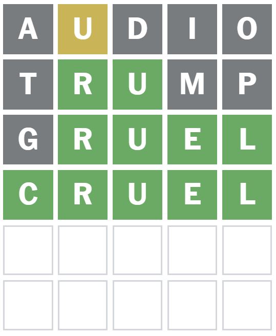I then wanted to guess a word that puts the U in a different position and so I guessed the word ‘TRUMP’ next.