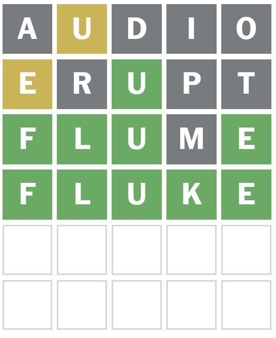 The next word I guessed was ‘FLUME’ as it puts the E in a different position and uses different letters than the ones already guessed.