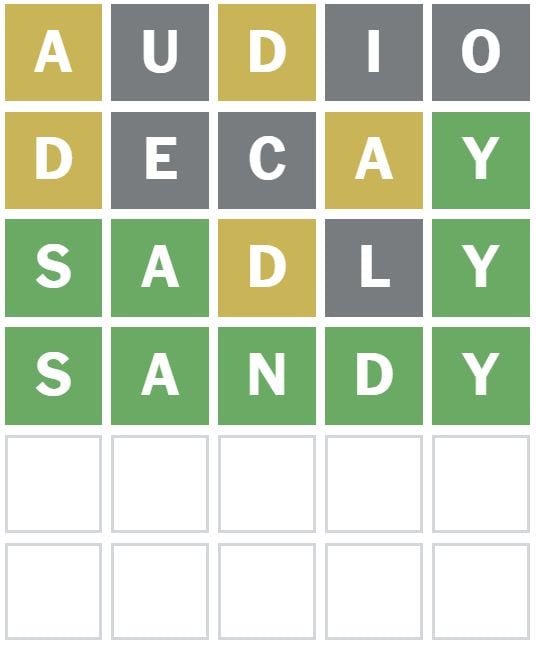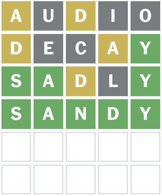 ‘SADLY’ was the next word I guessed as it put the known letters in different positions and uses different letters than the ones previously guessed.